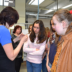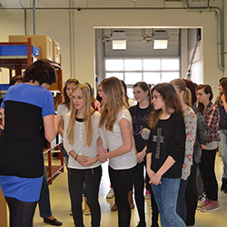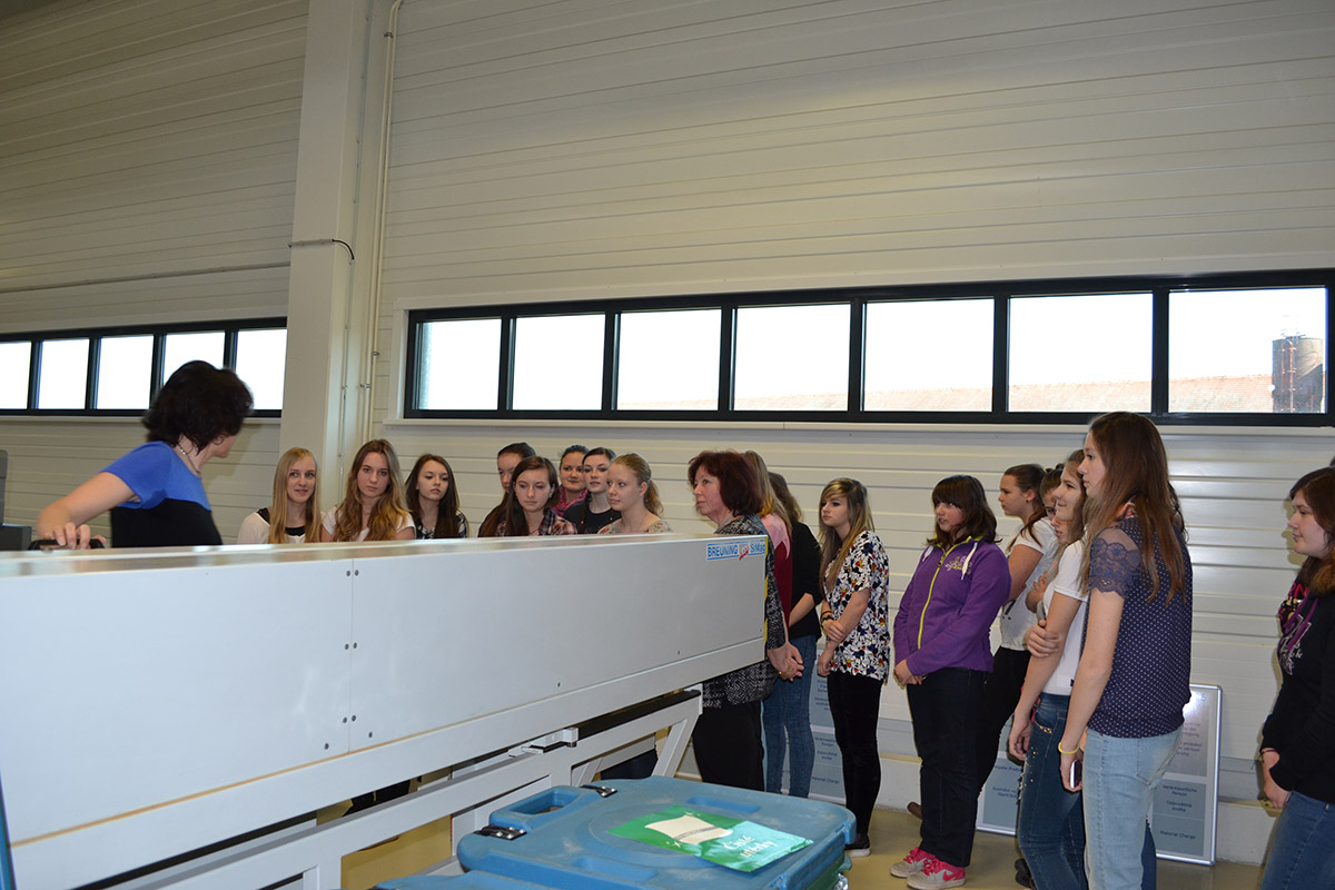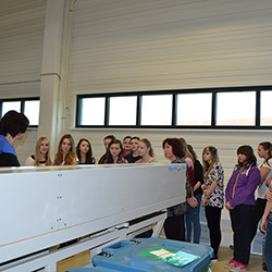 Ve druhé části exkurze se dívky podívaly přímo do výrobní haly. Viděly oddělení kovoobrábění, kde si prohlédly jednotlivé CNC stroje při jejich výrobě hliníkových částí per, dále oddělení vstřikovny či potisku, kde měly možnost prohlédnout si, jak vypadá potisk jednotlivých platových částí per. Poslední část výrobní haly byla tzv. čistý prostor, kde je přísně střežena čistota a vstup zaměstnanců je možný pouze v čepici, plášti a speciálních botách. V této části nahlédly ještě do materiálové propusti, kde se připravovaly výrobky ke kontrole a montáži v čistém prostoru.
