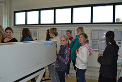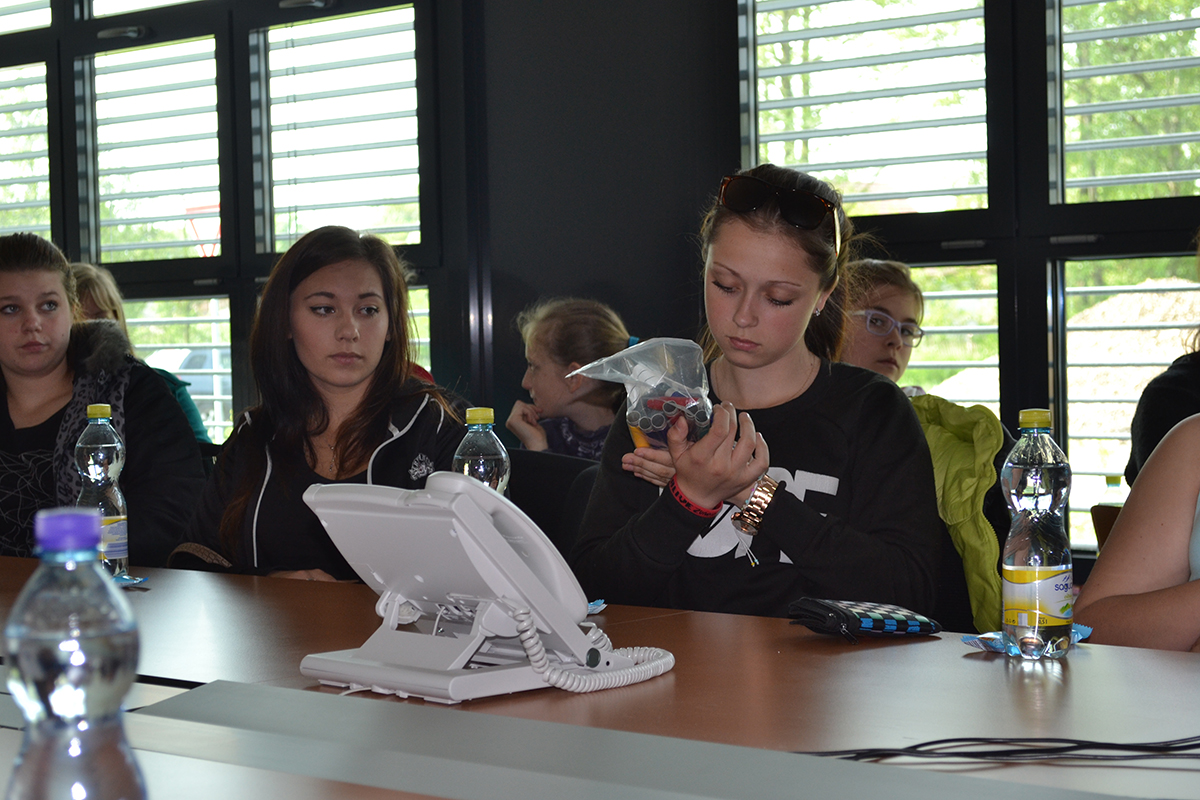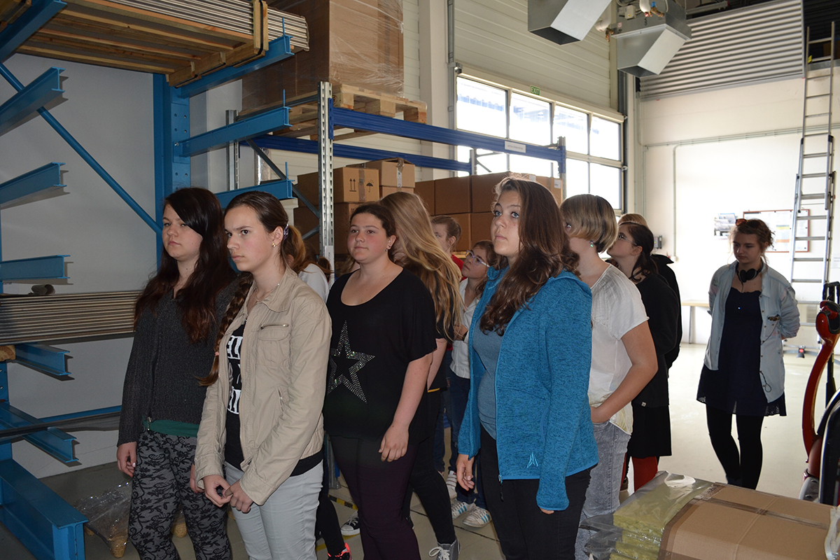 Ve druhé části exkurze se dívky podívaly přímo do výrobní haly. Viděly oddělení kovoobrábění, kde si prohlédly jednotlivé CNC stroje při jejich výrobě hliníkových částí per, dále oddělení vstřikovny či potisku, kde měly možnost prohlédnout si, jak vypadá potisk jednotlivých platových částí per. Poslední část výrobní haly byla tzv. čistý prostor, kde je přísně střežena čistota a vstup zaměstnanců je možný pouze v čepici, plášti a speciálních botách. V této části nahlédly ještě do materiálové propusti, kde se připravovaly výrobky ke kontrole a montáži v čistém prostoru.