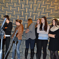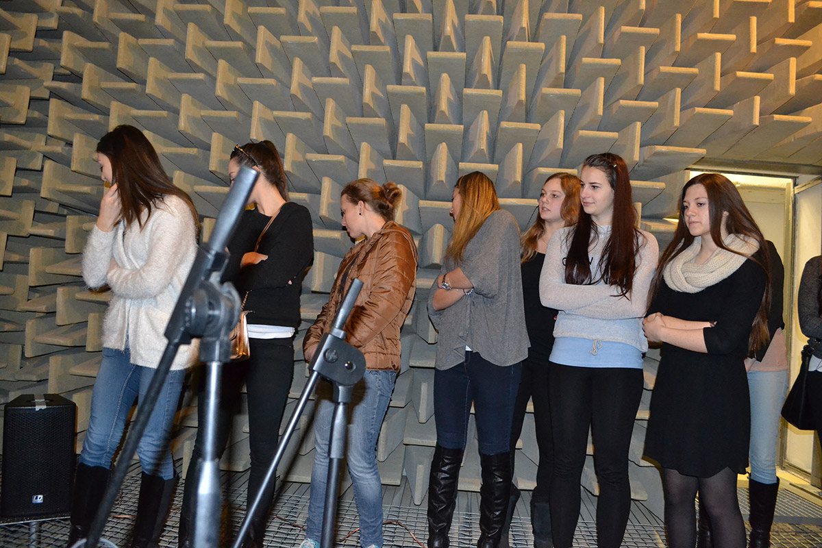 V akustické laboratoři si prohlédly poslechové studio a mixážní pult. V dozvukové komoře se dozvěděly, jak funguje měření stavebních materiálů a jejich tlumení zvuku. V bezodrazové komoře zjistily, jak se měří hlučnost strojů a zařízení.